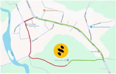 Vi bygger ut vår fabrik. Därför stängs vår ena infartsväg av från 16/3-26 tills i höst/vinter. Använd därmed endast infarten via Centralvägen (grön väg) och ej via Parkvägen (röd väg).
