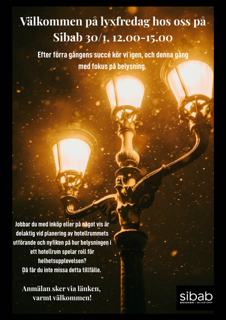 Anmälan sker via länken Lyxfredag på Sibab-Tema belysning där du även hittar ytterligare information.